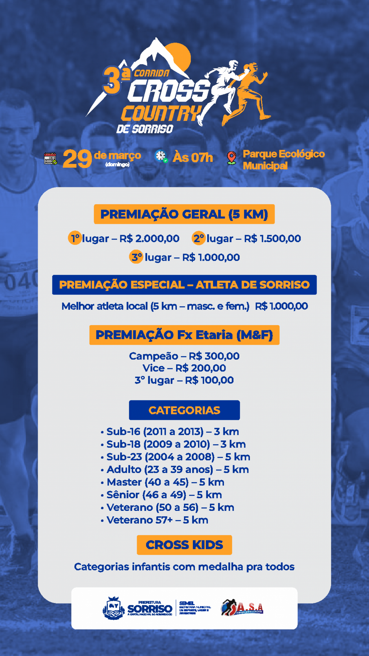 A Prefeitura de Sorriso, por meio da Secretaria Municipal de Esporte, Lazer e Juventude, realiza no dia 29 de março a 3ª edição da Corrida Cross Country. A prova será disputada no Parque Ecológico e contará com percursos de 3 km e 5 km.